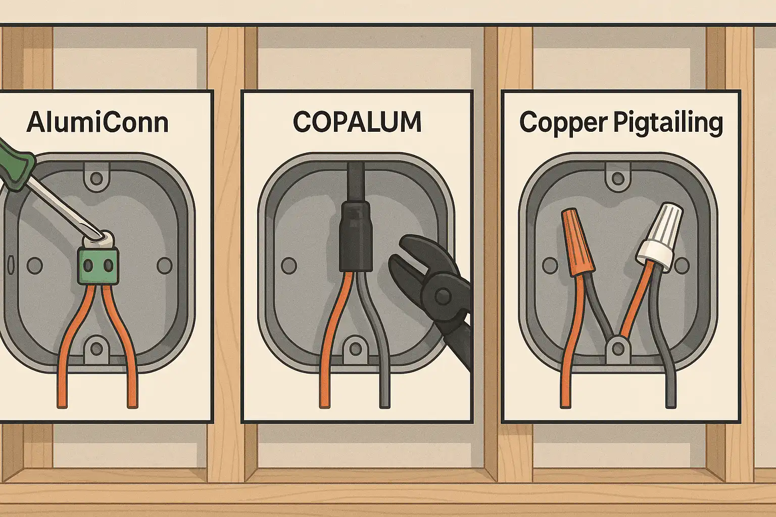 Pigtailing is a repair technique in which a licensed electrician attaches a short length of copper wire to the end of each aluminum wire at every connection point — outlets, switches, light fixtures, and junction boxes. The copper extension is connected using a CPSC-approved connector (either an AlumiConn connector or a 3M Purple Wire wire nut).