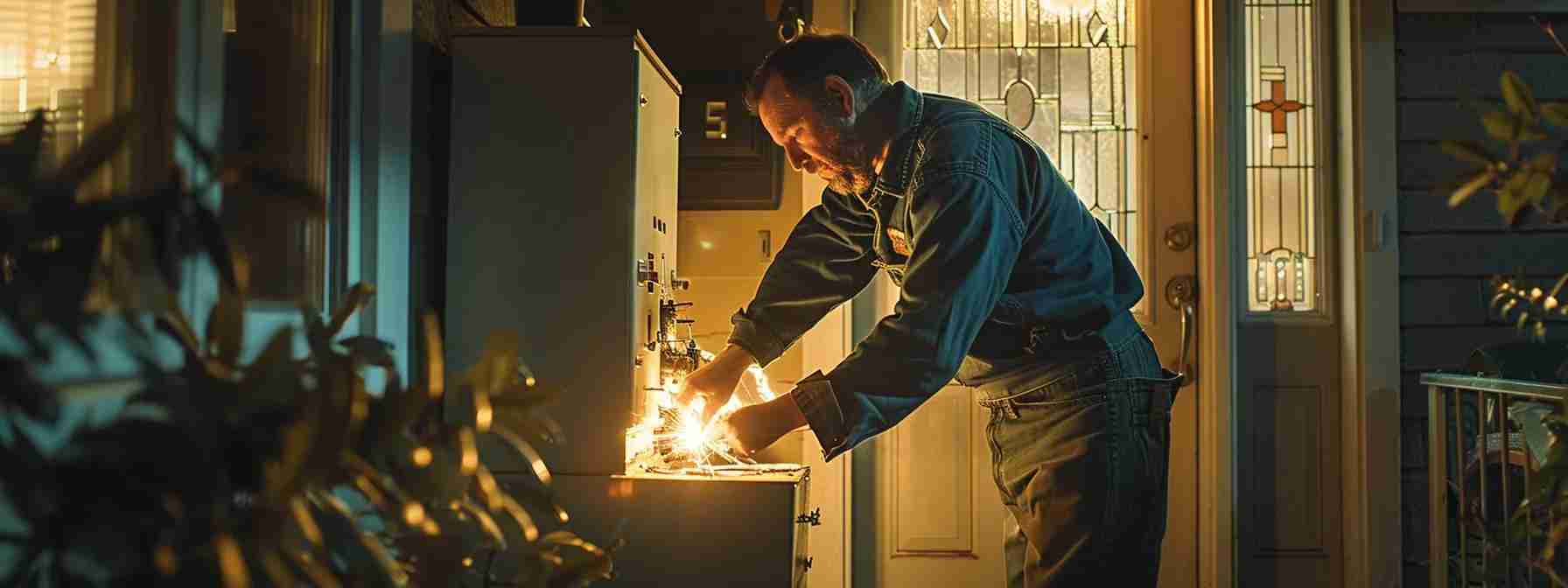 a skilled electrician in overalls confidently repairing a sparking electrical panel in a well-lit calgary home.