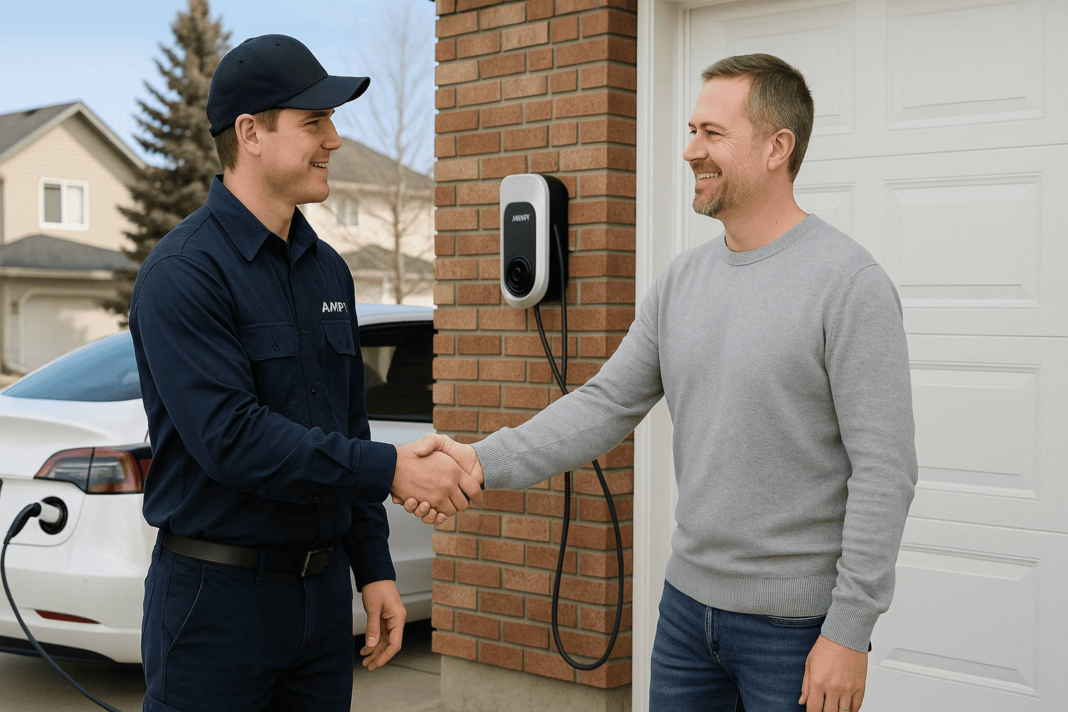 Professional electrician from Ampt Over Electric shaking hands with a homeowner in front of a newly installed EV charging station at a Calgary residence
