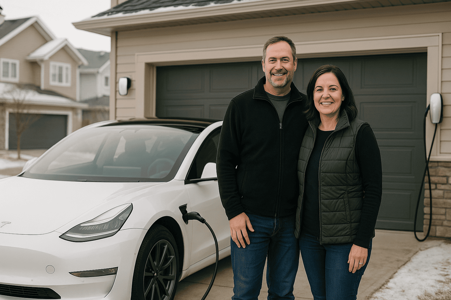 Smiling couple standing in front of their home next to a white electric vehicle charging with a Level 2 charger in a Calgary residential neighborhood